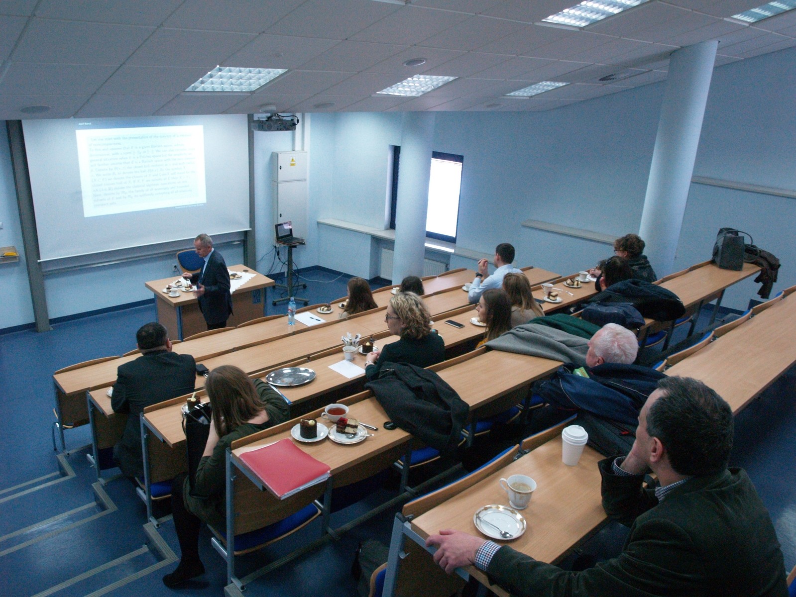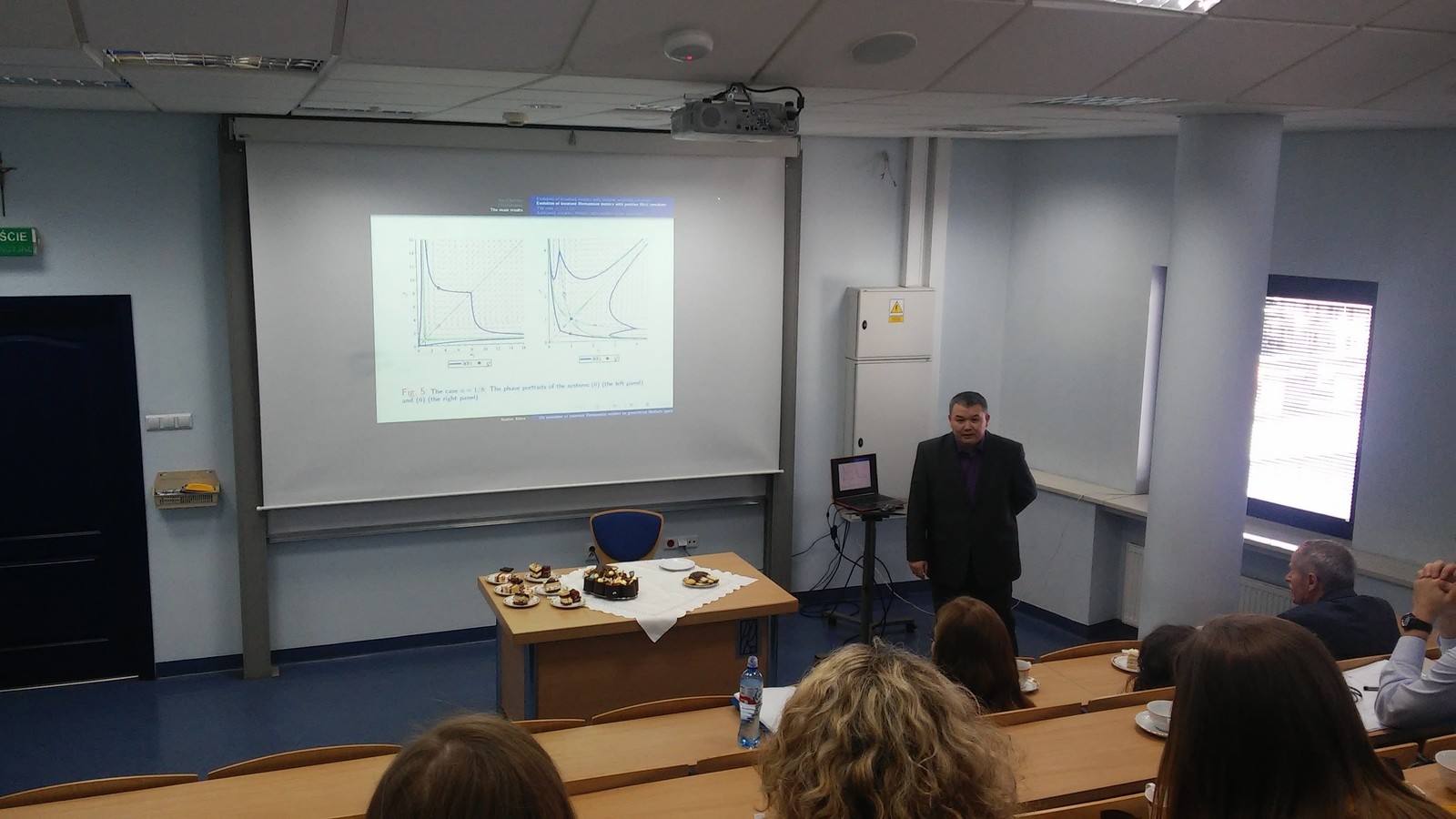W drugiej części seminarium odczyt wygłosił zaproszony w ramach ERASMUS gość z Kazachstanu, Taraz State University, prof. dr. Nurlan Abiev. Tytuł odczytu p. prof. Abieva brzmiał "On evolution of invariant Riemanian metrics on generalized Wallach spaces under the normalized Ricci flow" i dotyczył obszaru geomertii różniczkowej. W ramach odczytu prof. N. Abiev omówił rezultaty osiągnięte w prowadzonych przez Niego badaniach.